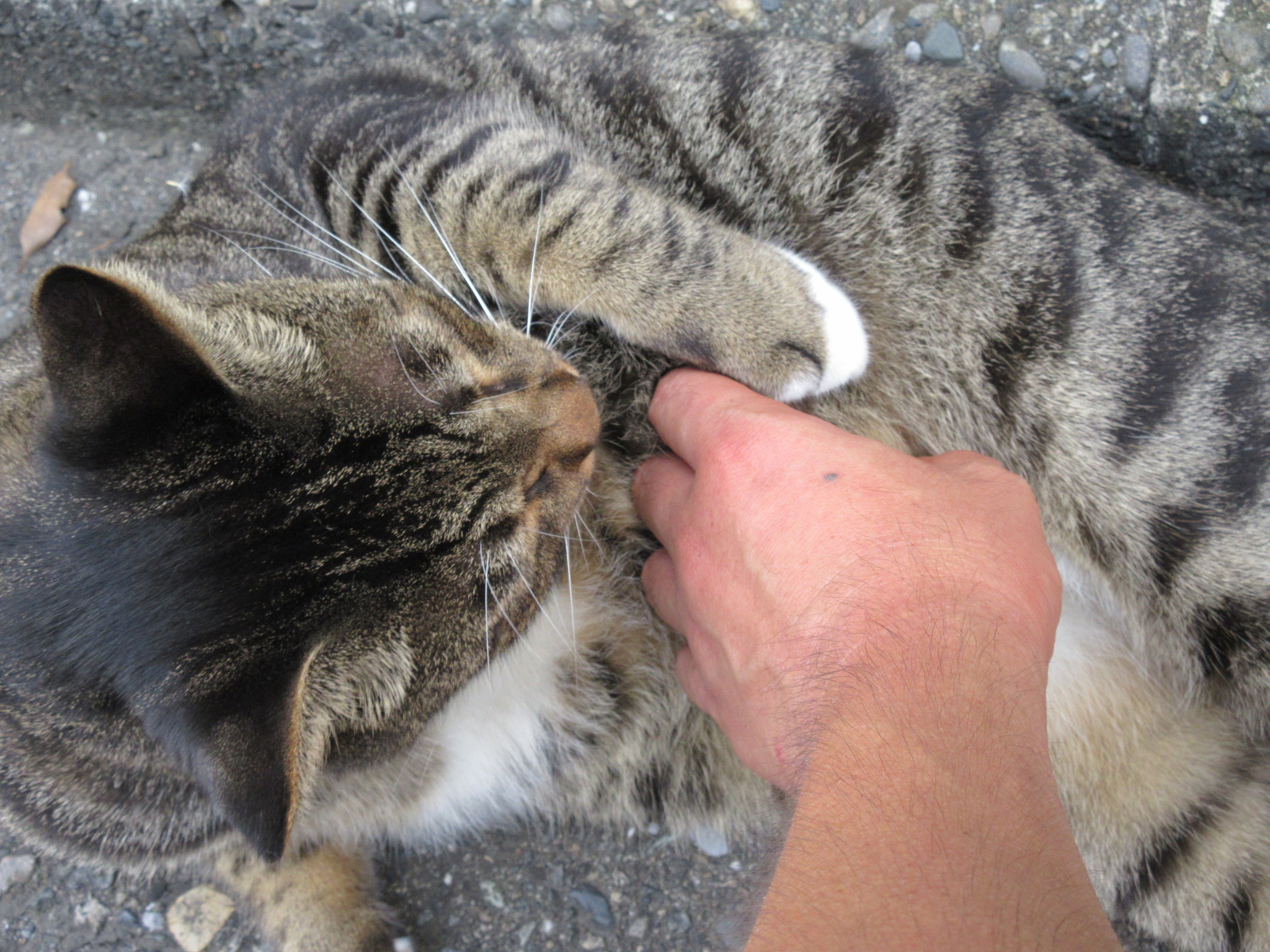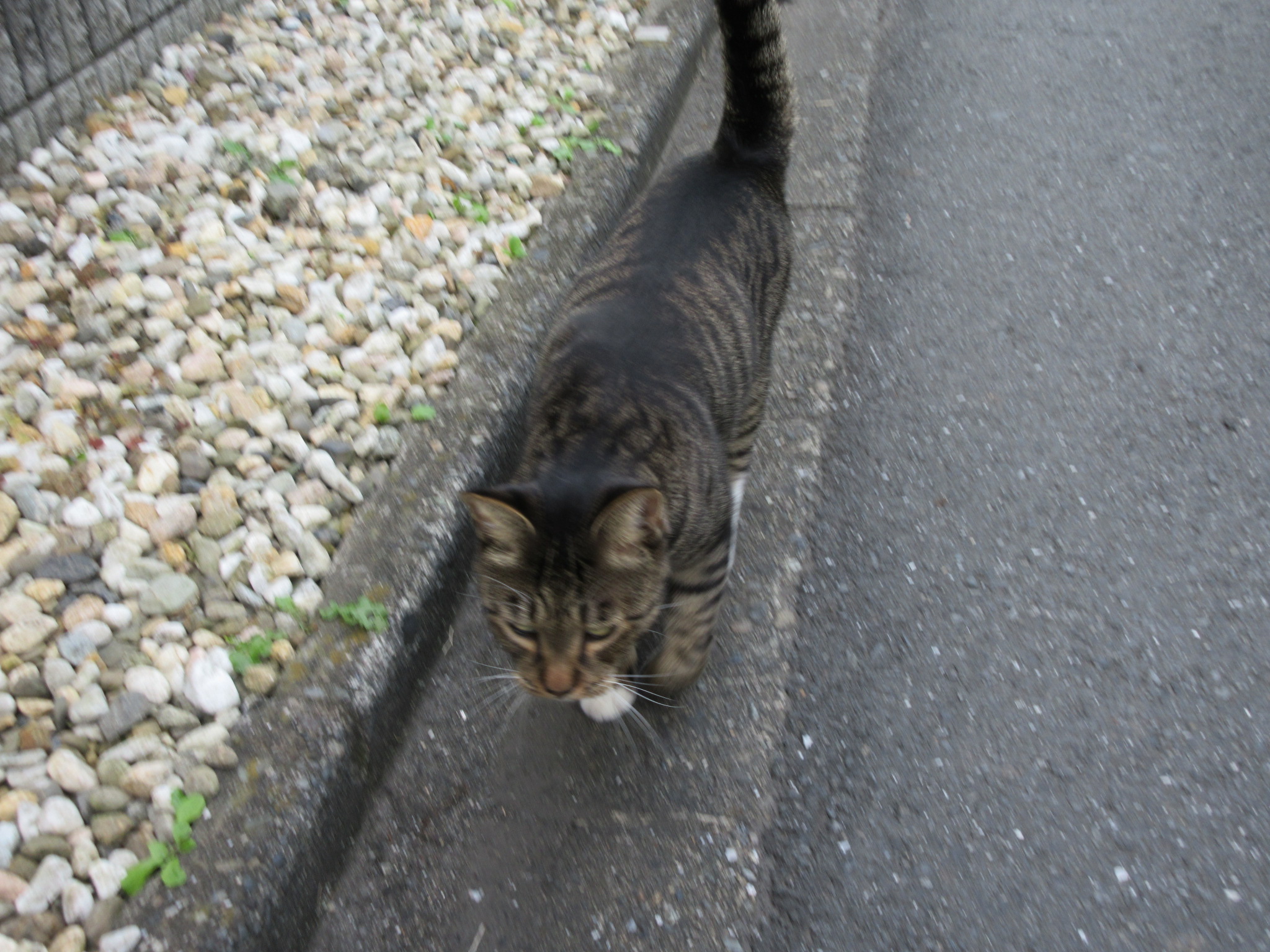 ラジオを聴きながらその道を、秩父方面に向かって歩いていたら…十字路の交差点の手前付近にある土手の上から「タタッ!」と、1匹のハチワレが降りて来た。